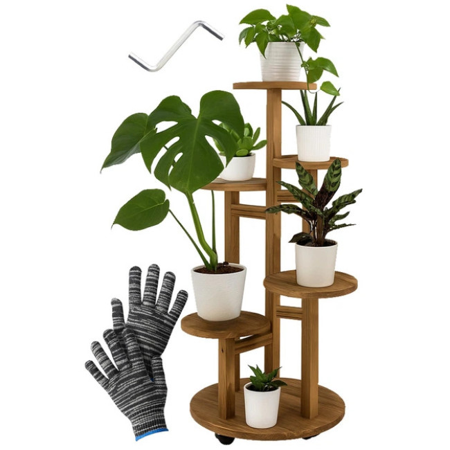 Стильна та функціональна підставка RUHHY з натурального соснового дерева дозволяє ефектно розмістити до 7 рослин на 6 рівнях. Це ідеальне рішення для вітальні, балкона або тераси: вона економить місце, упорядковує колекцію рослин і стає справжньою прикрасою інтер'єру. Завдяки поворотним колесам ви зможете легко переміщати свій «домашній сад», не дряпаючи підлогу.