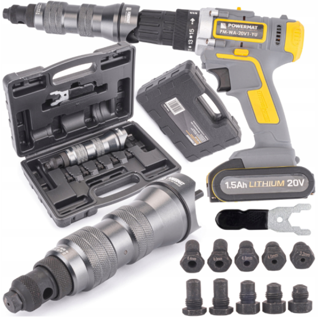 Комплект включает сам адаптер POWERMAT, транспортировочный кейс, ключ для замены насадок, руководство по эксплуатации на польском языке и набор насадок различных размеров для заклепок. Это устройство станет незаменимым помощником на вашей мастерской, обеспечивая точность и надежность работы.