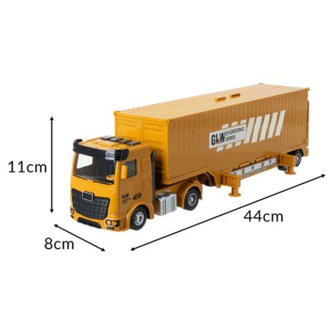 Реалистичный набор машин – в комплекте большой тягач с раскладной платформой, бетономешалка, каток, погрузчик, экскаватор, самосвал и подъемник.