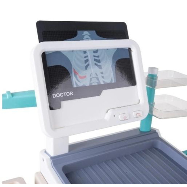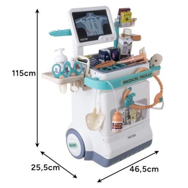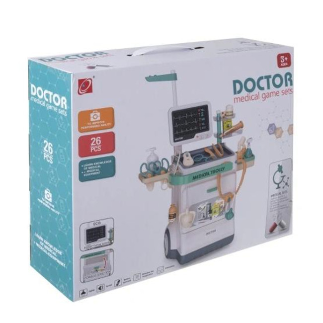 -Тележка с ЭКГ и рентгеном, стетоскоп, термометр, стоматологическое зеркало, молоток, шприц, ножницы, пинцет, скальпель, рентгеновские снимки, очки, лекарственные препараты, бутылочка для дезинфекции и другие аксессуары, инструкция и красочная подарочная упаковка.
