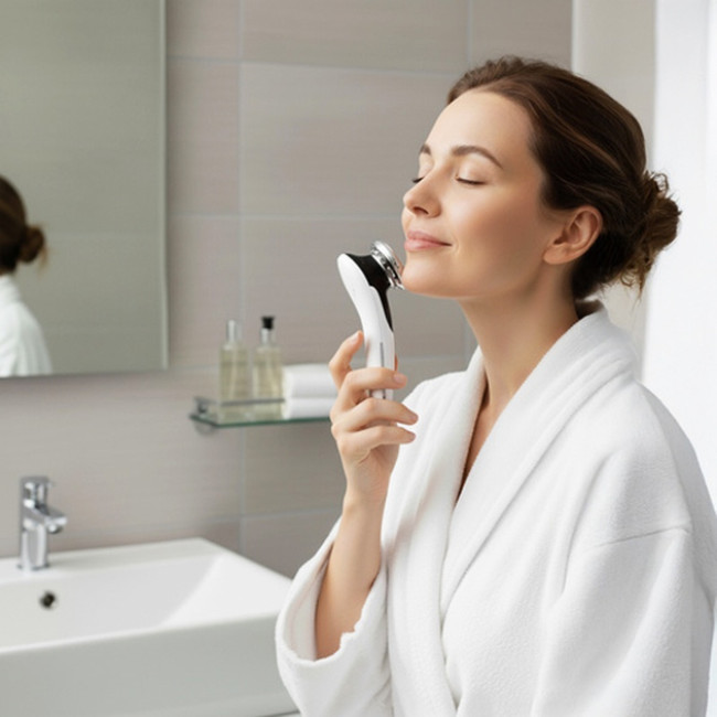 Тепло и холод в одном устройстве – массажер предлагает функцию термотерапии: согревает для лучшего впитывания косметики и охлаждает, чтобы закрыть поры и уменьшить отек.