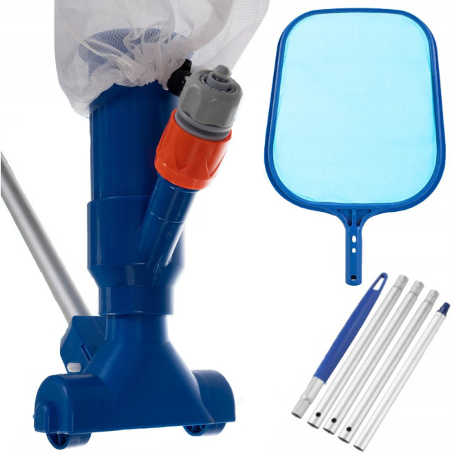 2 в 1 - один набор, но две практичные функции. В комплект входит сачок для сбора более крупных примесей с поверхности воды в бассейне и пылесос для дна бассейна с водяным приводом.