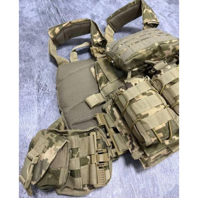 - 4 кармана для магазина, карман под гранату, карман под рацию и карман под аптечку.