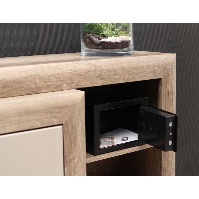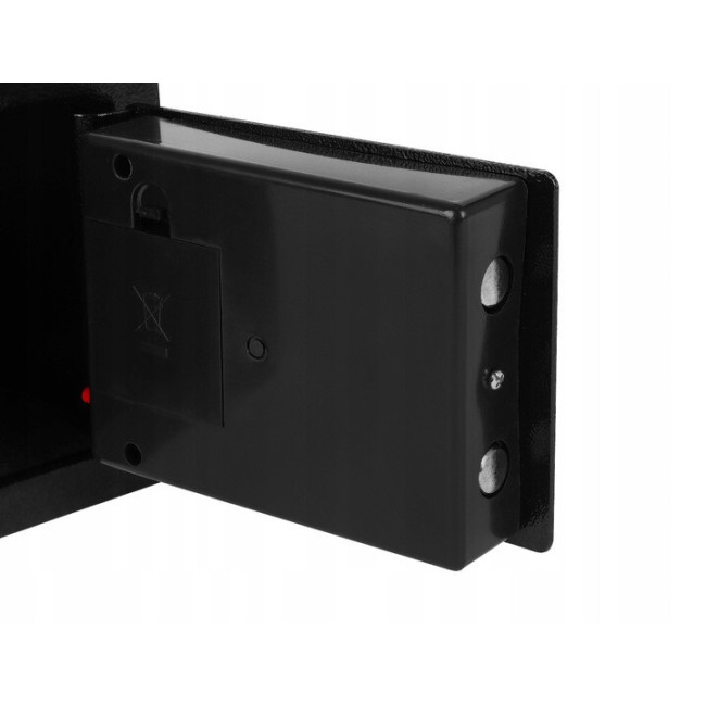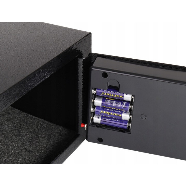 Прочная конструкция и возможность установить собственное шифрование обеспечивают надежность и безопасность, а также гарантируют, что никто другой не получит доступ к контенту. Сейф прочный, устойчивый к повреждениям и относительно тяжелый. Таким образом, снижается риск того, что весь тайник будет украден и вынесен незамеченным за пределы объекта или помещения, где он находится. Закрытие дверей толстыми ригелями эффективно играет дополнительную защитную роль, предотвращая их взлом. Безопасный обеспечивает возможность хранения всех важных вещей, в том числе: деньги, ювелирные изделия, документы или небольшое электронное оборудование, а также носители информации с конфиденциальными данными. Размеры внутреннего пространства сейфа позволяют разместить в нем листы формата до А5 и всевозможные мелкие и дорогостоящие предметы. Дно сейфа можно обшить прилагаемой тканевой подкладкой . Он защитит украшения или другие ценные вещи от случайных повреждений и царапин. На передней части двери расположена электронная панель управления. Питается от 4 батареек (входят в комплект). У нас также есть доступ к традиционному ключу . Позволяет открыть сейф в экстренной ситуации. на случай, если вы забудете код. Поэтому ключ следует хранить вдали от сейфа, чтобы предотвратить несанкционированный доступ. На двери сейфа установлена ??ручка для открытия двери сейфа . Светодиоды над панелью предоставляют информацию о состоянии батареи и правильности выполнения действий. При необходимости замены аккумулятора светодиод загорится после открытия сейфа. С помощью панели вы можете установить и изменить свой персональный код доступа. Если пароль введен неправильно три раза, прозвучит звуковой сигнал и клавиатура заблокируется на 30 секунд.