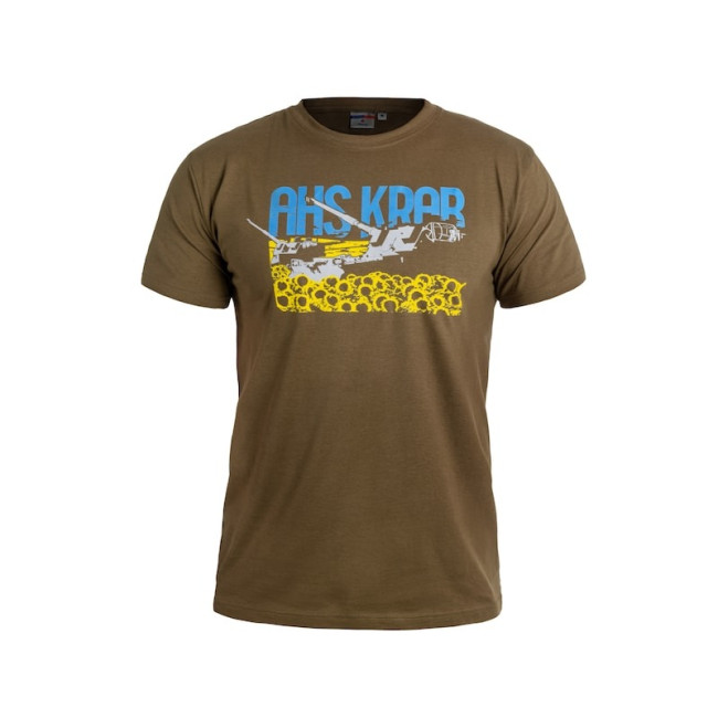 Спереди на футболке находится графическое изображение самоходной гаубицы KRAB на фоне флага Украины, который компонуется с полем подсолнухов и надписью AHS KRAB. Принт не теряет цвет при стирке и длительном ношении.