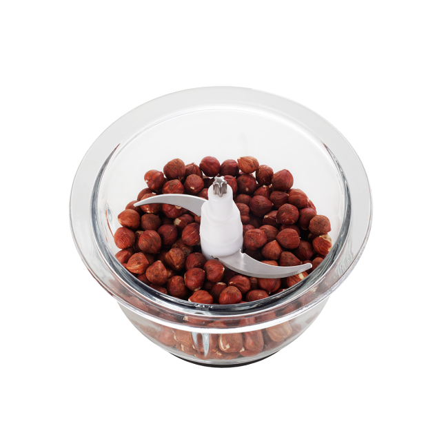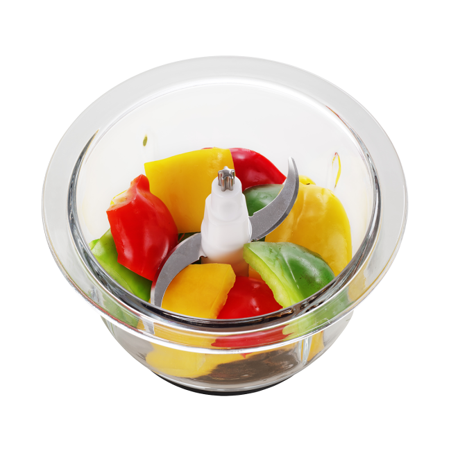 Простота управления делает использование этого устройства интуитивно понятным и доступным даже для начинающих кулинаров. Для удобства пользователей предусмотрены две скорости измельчения, что позволяет выбрать оптимальный режим в зависимости от вашего рецепта и пожеланий. Прозрачная стеклянная чаша объемом 1,2 литра дает возможность легко следить за процессом. Она также сохраняет нейтральность вкусов, не впитывая запахи и краски.