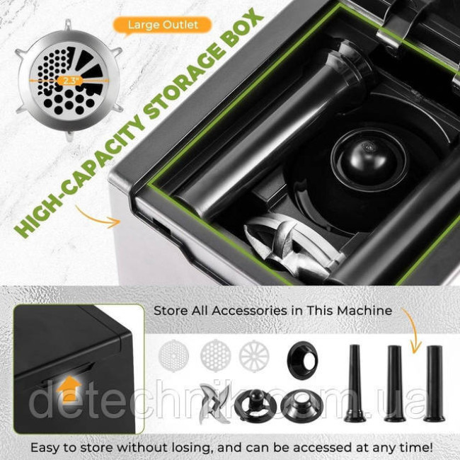 Благодаря большой емкости хранения все аксессуары этой мясорубки можно хранить, не теряя их, и к ним легче получить доступ в любое время. Оснащенная большим выходным отверстием 2,3 дюйма, эта мясорубка может изготовить больше фарша за 1 минуту.
