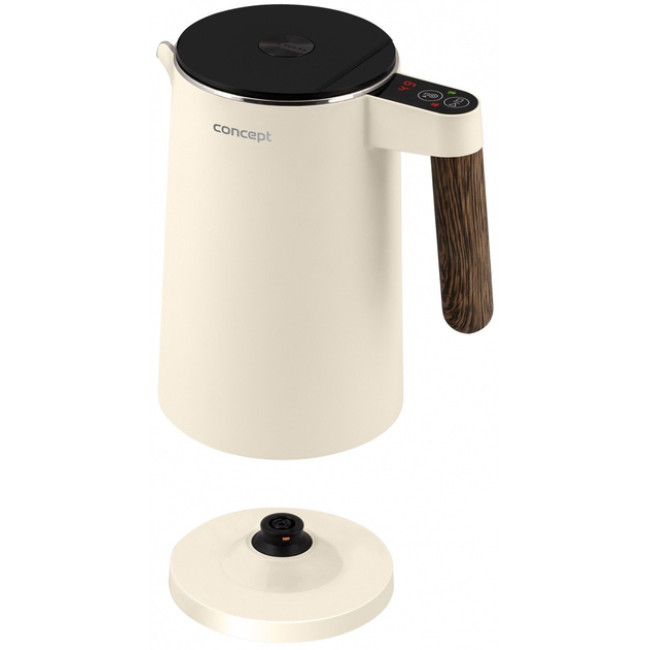 Электрочайник Concept RK3304 Norwood Ваниль – это стильный и функциональный прибор, который гармонично дополнит интерьер любого современного дома. Благодаря своему великолепному дизайну, объединяющему матовую ванильную поверхность и искусственно выполненную деревянную ручку, этот чайник станет не только практичным помощником, но и эстетическим акцентом на вашей кухне. Основное преимущество модели RK3304 заключается в возможности регулировки температуры, что позволяет нагревать воду не только до кипения, но и до более низких температур, например 45°C, что особенно полезно для любителей качественного чая, кофе или даже для приготовления детского питания. Правильно подобранные параметры кипячения помогут сохранить целебные свойства и тонкие вкусовые нотки напитков. Одной из ключевых особенностей электрочайника является его двухстенная конструкция с уникальной поверхностью Cool Touch, которая не нагревается при кипячении и защитит вас от ожогов. Это позволяет использовать чайник с максимальным комфортом и безопасностью даже для самых маленьких пользователей. Внутренняя часть выполнена из высококачественной нержавеющей стали, что гарантирует долговечность и сохраняет высокую температуру воды длительное время. Чайник Concept RK3304 оснащен надежным разъемом от британского бренда STRIX, который известен своим высоким качеством и долговечностью. Это важный элемент конструкции, отвечающий за безопасность и долгий срок службы прибора. Функция Keep Warm дополнительно поддерживает температуру воды, что позволит не только сэкономить время, но и электроэнергию. Комфорт в использовании обеспечивает большая кнопка для легкого открывания крышки и наличие широкого отверстия для залива воды, благодаря чему наполнять чайник невероятно просто. Гладкое дно с скрытым нагревательным элементом препятствует образованию налета и облегчает чистку устройства. Поворотная база с возможностью хранения кабеля является еще одним практичным дополнением, позволяя разместить чайник максимально удобно. Для обеспечения дополнительной безопасности модель RK3304 оснащена двойной системой защиты. Она автоматически отключает прибор при достижении температуры кипения или при попытке включения без воды, предотвращая возможные поломки и гарантируя долговечность эксплуатации. Характеристики:- Шкала уровня воды: Со шкалой