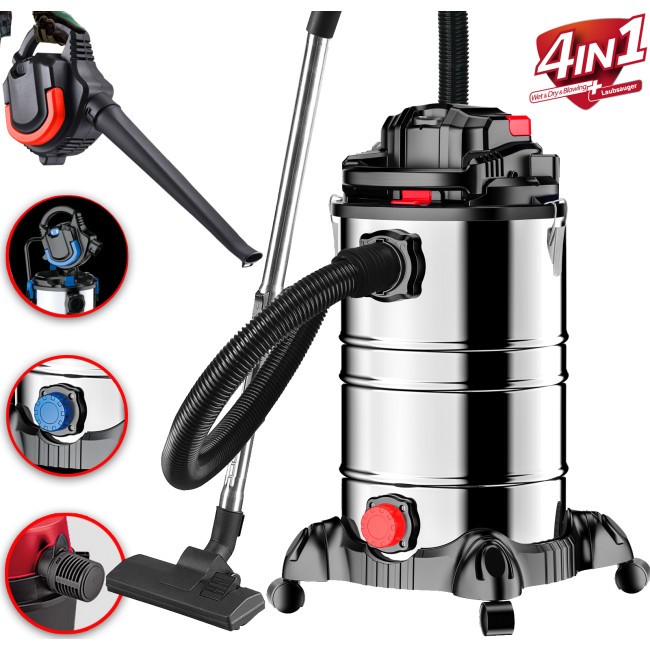 Универсал: наш промышленный пылесос выполняет все функции универсального пылесоса. С помощью функции сухого пылесоса вы без труда уберете пыль, грязь, древесную стружку или даже песок. Пролитые жидкости, такие как молоко, кофе, вода или сок, можно легко собрать с помощью функции влажного пылесоса. Осенью наш промышленный пылесос можно использовать даже в качестве пылесоса для листьев благодаря функции продувки.