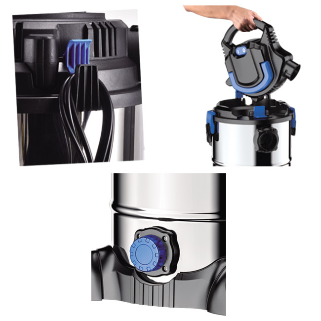 Контейнер XXL: наш универсальный пылесос емкостью 30 литров используется как пылесос для сухой уборки с мешком и фильтром, а также как безмешковый пылесос для воды с практичным сливом воды. Благодаря большой вместимости контейнера вы избавите себя от хлопот, связанных с повторным опорожнением.