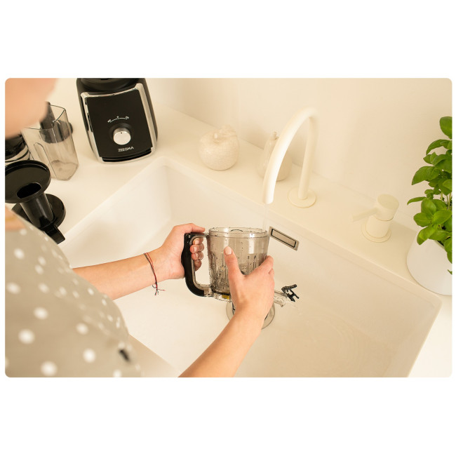 Шнековая соковыжималка Zeegma Sap изготовлена ??из безопасных материалов без содержания BPA. Система ThermoFuse защищает его от перегрева, а двухступенчатая блокировка облегчает сборку отдельных элементов. Нескользящие ножки обеспечивают устойчивость, а специальная непроливающая пробка предотвращает проливание остатков сока.