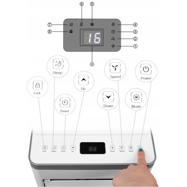 MODE Нажмите, чтобы переключить режим работы между вентилятором, охлаждением и осушением.