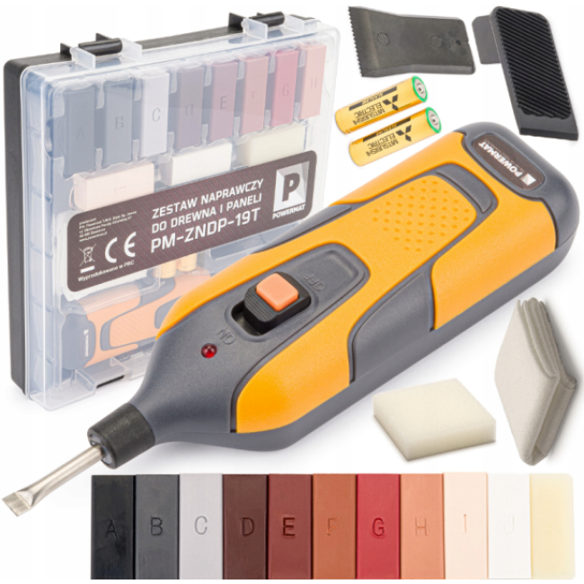 Набор включает все необходимые аксессуары для работы: полировальные губки и салфетки, специально разработанные стамески и оригинальную упаковку. Помимо использования на дереве, данный набор позволяет проводить ремонтные работы на каменных и керамических поверхностях.