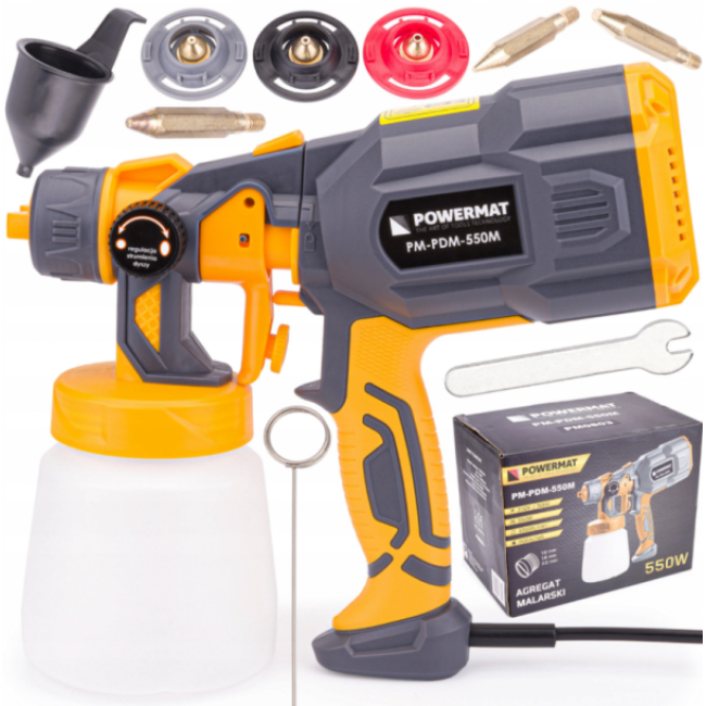 Краскопульт HVLP от POWERMAT оснащен надежным и мощным двигателем 550 Вт и является незаменимым инструментом для бытового использования.