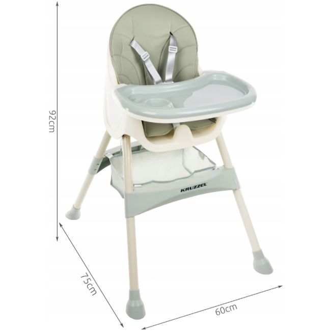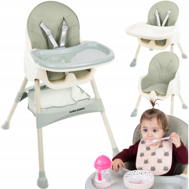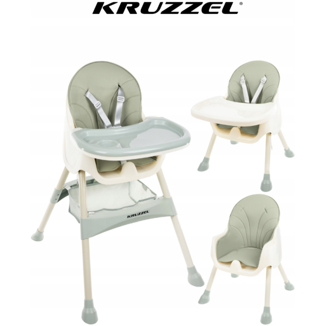 Кресло KRUZZEL 3-в-1 — идеальное решение для ежедневного кормления вашего ребенка. Кресло легкое, мягкое и удобное в использовании. Стул подходит детям от 6 месяцев. Имеет съемную обивку из практичной экокожи, которую легко чистить и удобно использовать. Столешница имеет 3 уровня регулировки расстояния и съемный поднос. Дополнительным преимуществом являются 4 нескользящие ножки с соответствующим расстоянием между ними, обеспечивающие устойчивость кресла. Дополнительный профилированный предохранительный элемент между ножками, препятствующий соскальзыванию ребенка с кресла.