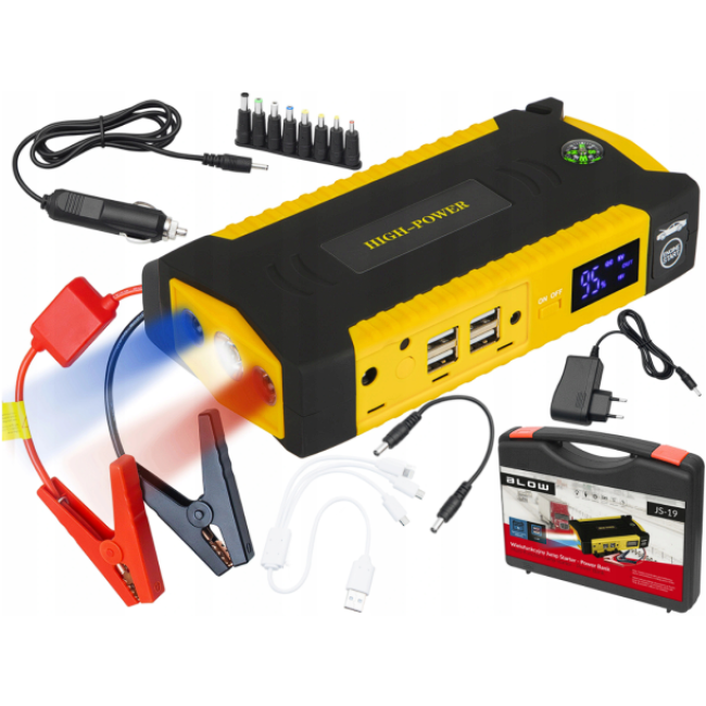 Инновационное технологическое устройство марки BLOW, с помощью которого в аварийной ситуации у нас есть возможность запускать мотоциклы, скутеры, квадроциклы, лодки, автомобили, когда наша батарея слаба или полностью разряжена. Кроме того, этот маленький и очень функциональный аккумуляторный автомобильный стартер также может служить блоком питания, поэтому мы будем заряжать батареи в смартфоне, ноутбуке, камере, планшете или другом электронном оборудовании.