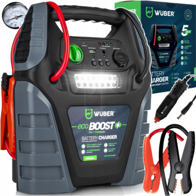 Відчули неприємність із розрядом акумулятора або недостатнім накачуванням шин? Пропонуємо ідеальне рішення - Пусковий пристрій з компресором 5в1 17Ач від Wuber, що виробляється в Польщі. Це універсальне рішення об'єднує в собі низку необхідних функцій для кожного автомобіліста та туриста.