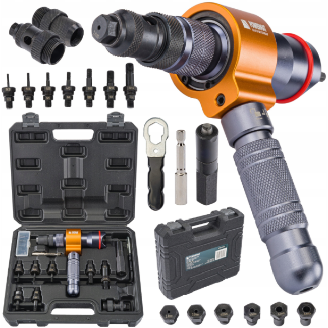 Цей заклепочник — ідеальний вибір для роботи з алюмінієвими, мідними, сталевими та нержавіючими заклепками. Обладнання включає транспортний кейс, гайковий ключ, головки та гайки для різних розмірів, тримач для відривних заклепок і адаптер HEX. Інструмент відрізняється міцністю і довговічністю, ідеально підходить для професійного використання.
