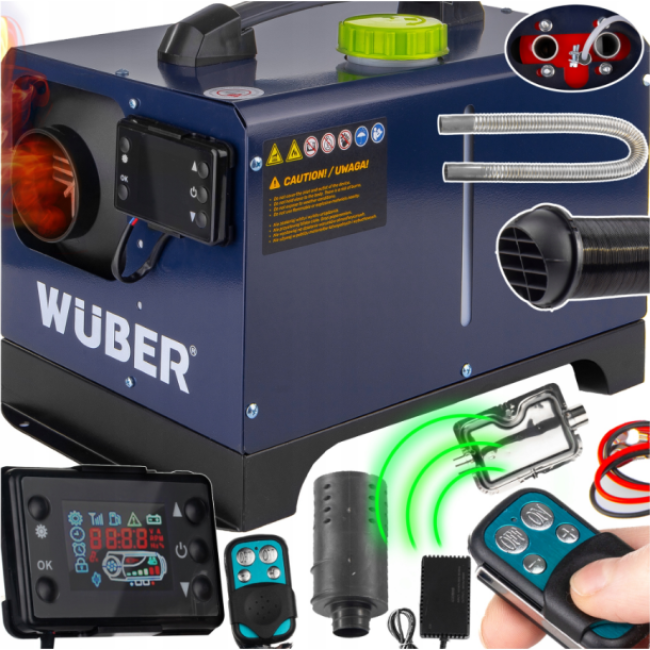 для дистанційного керування пристроєм . Крім того, пульт можна закріпити на шнурку, що буде дуже зручно, особливо якщо ви часто користуєтесь обігрівачем. Дальність дії пульта дистанційного керування - до 30 м. Закрита камера згоряння Обігрівач має закриту камеру згоряння, що забезпечує високу ефективність, унеможливлює запах вихлопних газів і не підвищує вологість повітря. Це робить прилад ідеальним для використання у різних автомобілях, яхтах, караванах чи приміщеннях. Однак важливо переконатися, що пристрій правильно встановлений, щоб дим виходив за межі приміщення. Різні джерела живлення Прилад можна підключати до різних джерел живлення. Кабель живлення дозволить живити обігрівач від розетки змінного струму 230 В/50 Гц. Блок живлення 12 В 15 А дозволить підключити обігрівач до прикурювача, а кабелі живлення 12 В - до акумулятора . Кабель живлення 230 В/50 Гц Елементи для монтажу Інструкція з експлуатації польською мовою Оригінальна упаковка виробника Характеристики: - Призначення: Промислове - Тип джерела енергії: Рідкопаливний - Тип палива: дизельне паливо (солярка)|бензин - Тип керування: Електронне