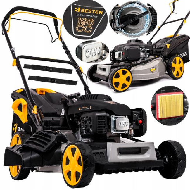 Газонокосарка BESTEN також відзначається плавним запуском, що значно зменшує зусилля, необхідні для початку роботи. В комплект входять два ножі, з яких один вже встановлений, насадка для мульчування та боковий відвід. Високоякісний фільтр знижує викиди, забезпечуючи екологічність пристрою.