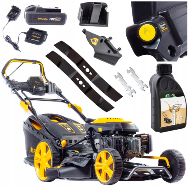 Комплектується додатковими аксесуарами, такими як запасний ніж, акумулятор та зарядний пристрій, які дозволяють почати роботу відразу після придбання. Оптимізація процесів через електрозапуск, фіксацію рукоятки та індикатор заповнення контейнера, додають зручності. Крок до інноваційного догляду за газоном з Riwall!