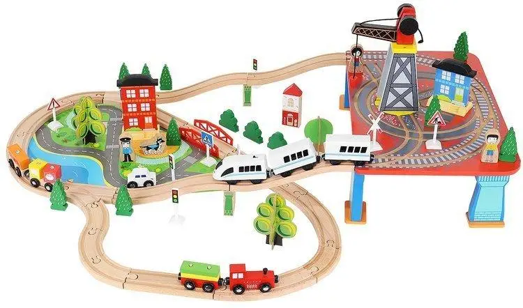 Набір містить 88 естетично привабливих елементів, які можна організувати згідно з особистими побажаннями. До комплекту входять не тільки рейки, а й вантажний та пасажирський потяг, автомобілі, декорації ландшафту (дерева та дорожні знаки), персонажі (три фігурки та поліцейський пес), порт з краном та дорога для автівок. Дерев'яні деталі є надійною альтернативою пластику, володіють великим запасом міцності, вони не бояться піску, трави або води. Гра на вулиці чи у внутрішніх приміщеннях з цим набором стає ще ближчою до природи.