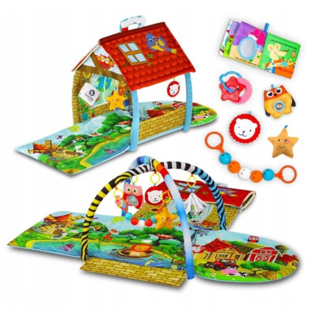 Благодаря сложенным бортикам и регулируемым стержням коврик трансформируется в большой домик, что сделает игру ребенка намного привлекательнее.