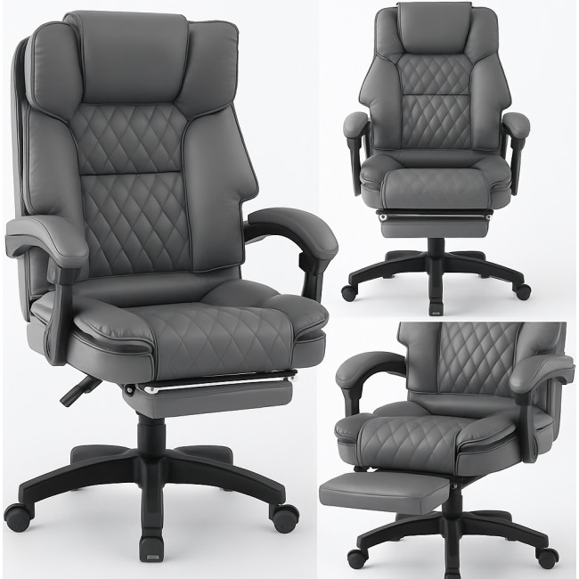 Офісне ергономічне крісло з підставкою для ніг Diego – комфортне комп'ютерне крісло з високою спинкою, сірого кольору (еко шкіра).